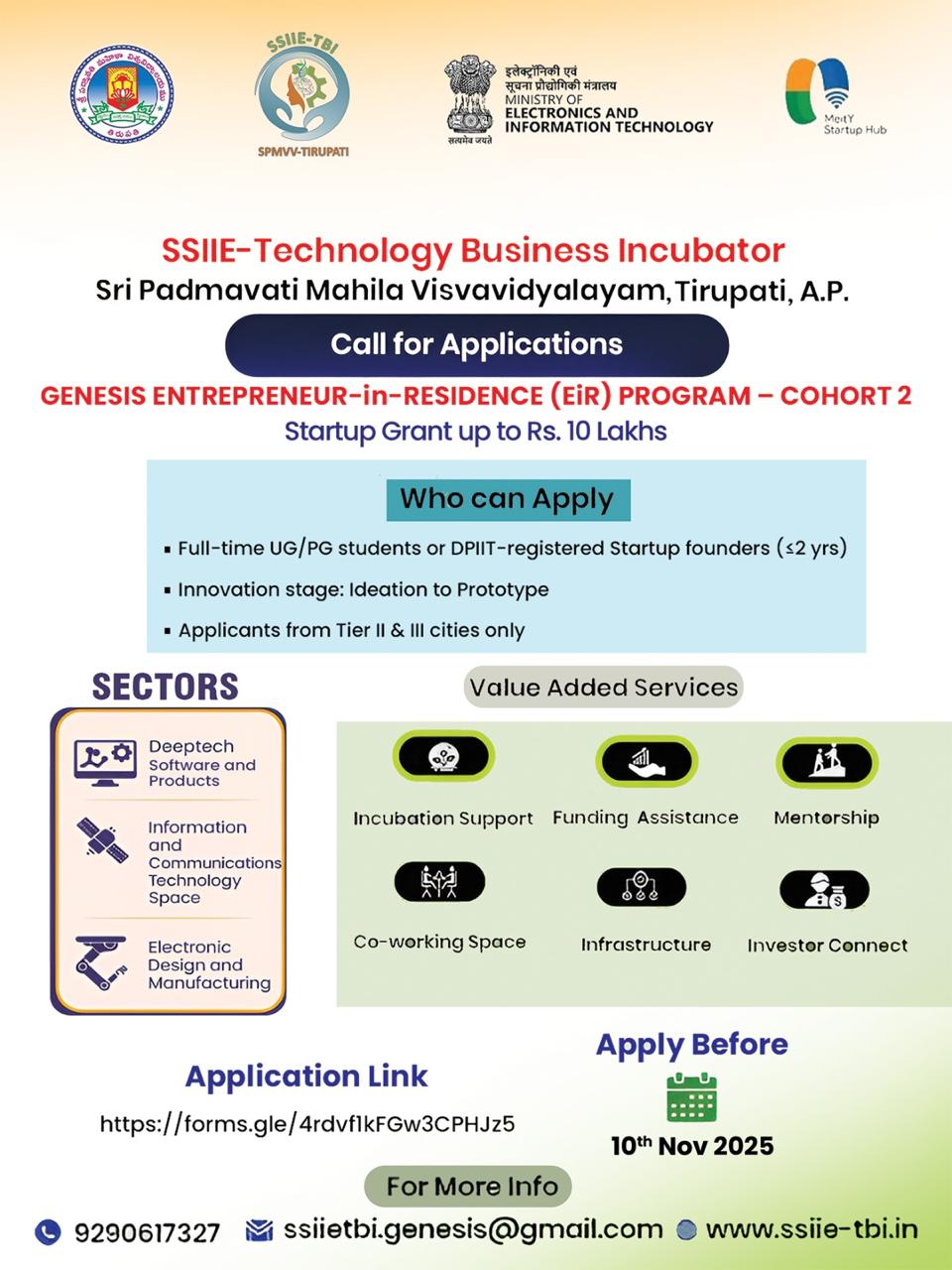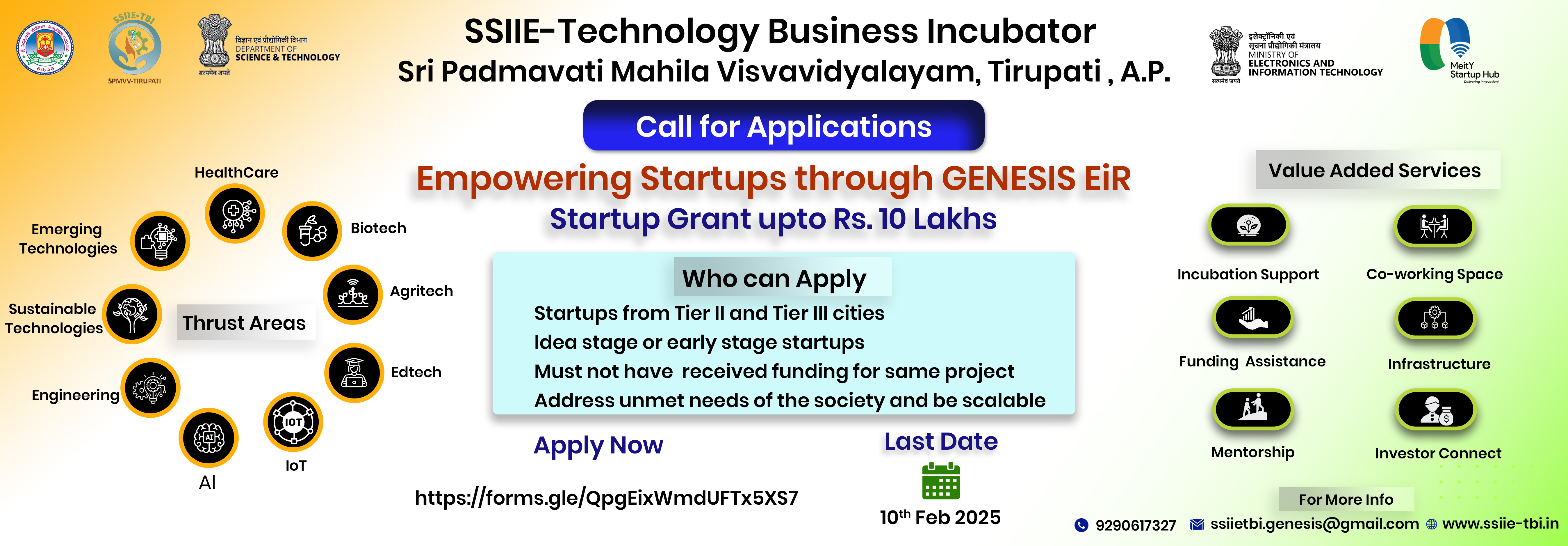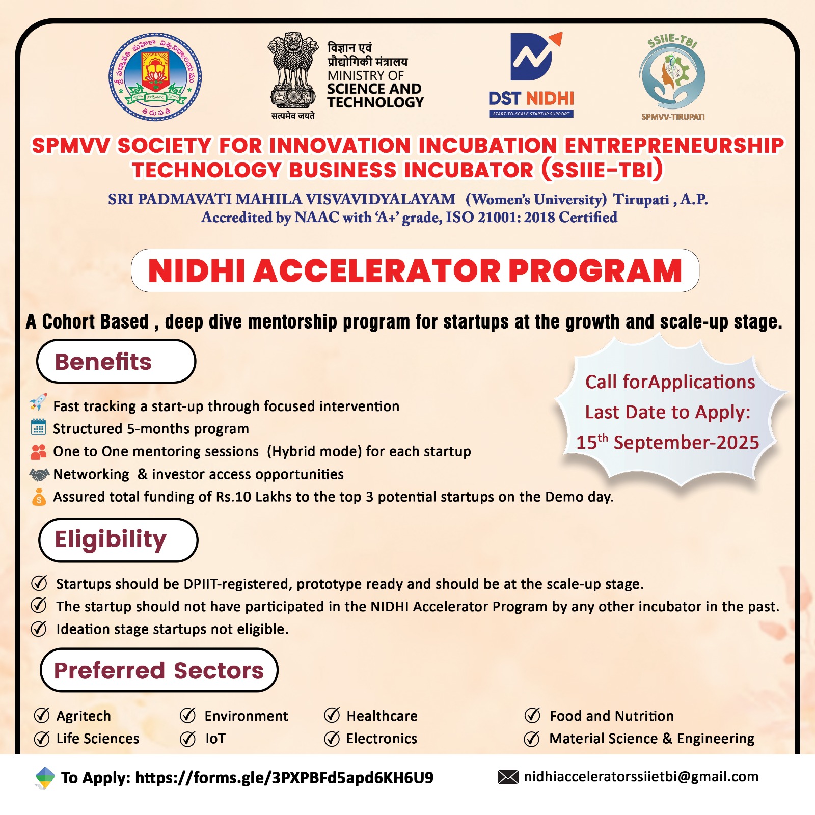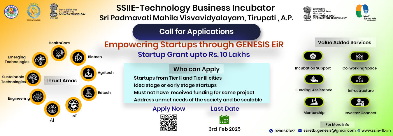 “SPMVV Society for Innovation Incubation Entrepreneurship - Technology Business Incubator” (SSIIE-TBI) is an initiative of Sri Padmavati Mahila Visvavidyalayam (Women’s University), Tirupati, Andhra Pradesh and National Science & Technology Entrepreneurship Development Board (NSTEDB), Department of Science and Technology (DST), Govt. of India.